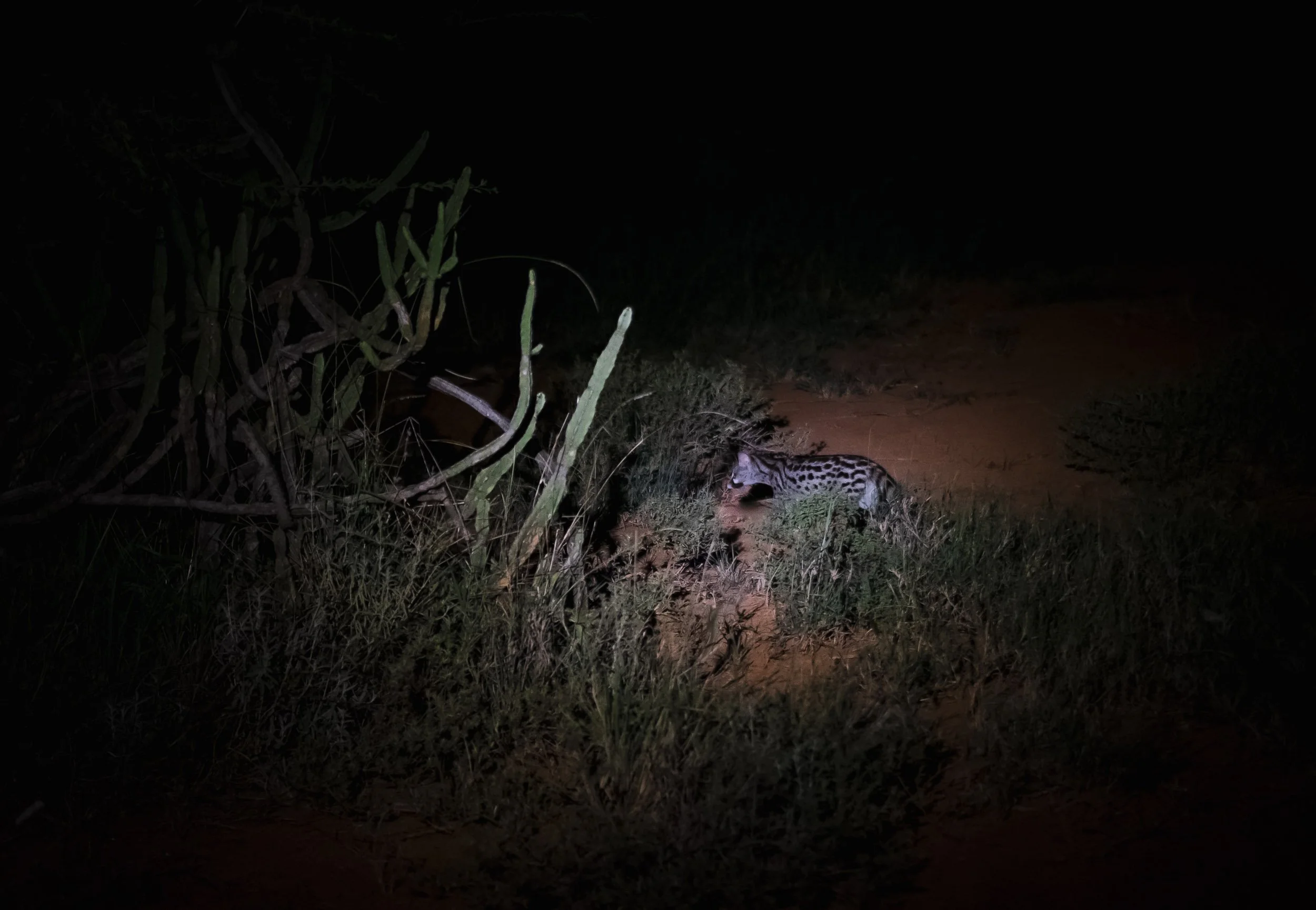 The rhythm of the first full day became our routine: exploring the surrounding area in the morning, enjoying the scenery, see what animals we can find, before staying close to the camp and waiting for Giza’s appearance in the early evening. We got lucky and spotted her almost every day, only the rain made things difficult one night. Nightly outings in the bush are always interesting, for instance, we spotted a striped polecat, also referred to as African skunk or zorilla - hard to photograph, so you’ll have to live with this image.