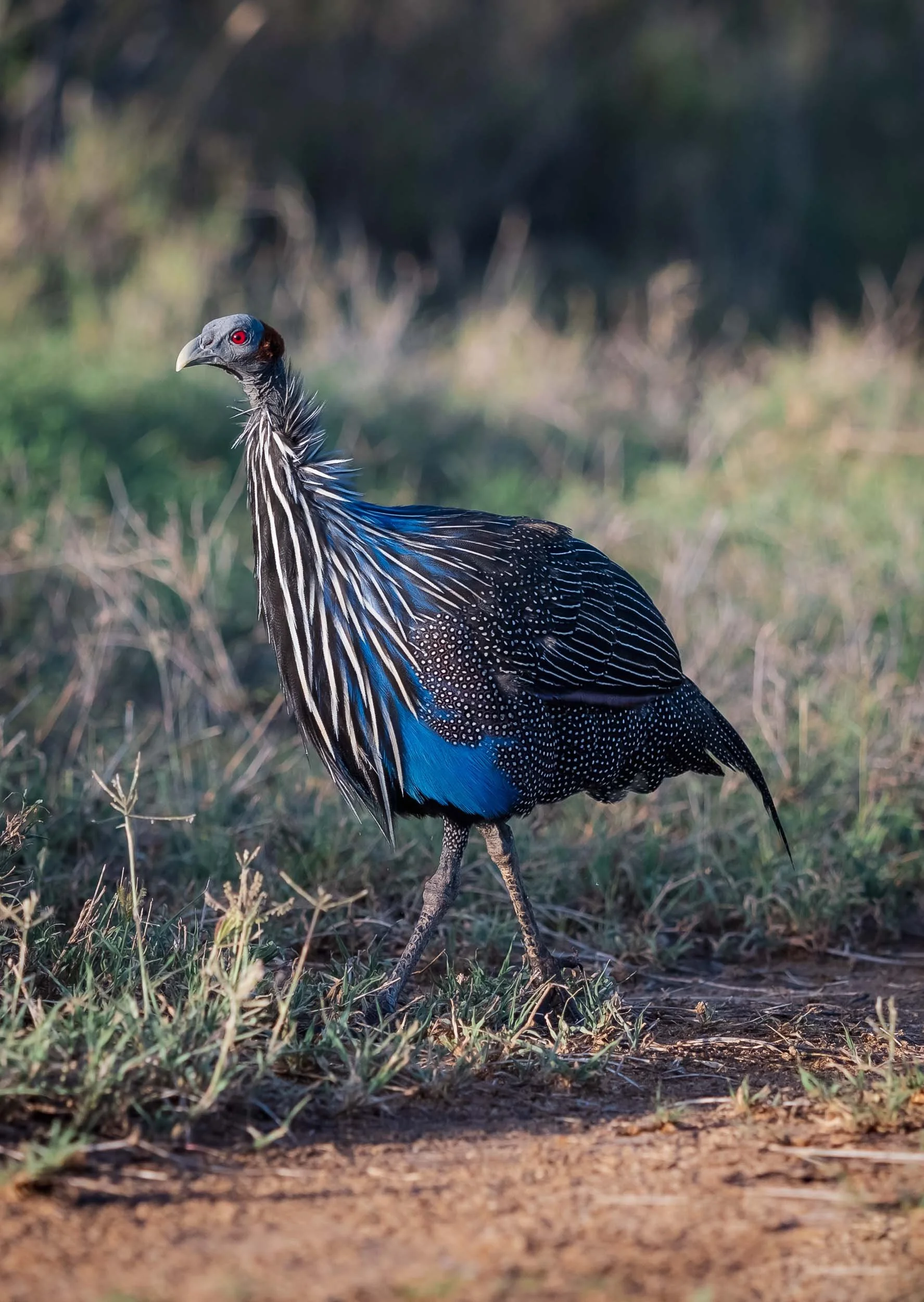 Laikipia is also home to the largest and probably most striking extant guinea fowl, the vulturine guinea fowl. It typically lives in flocks of about 20 birds.